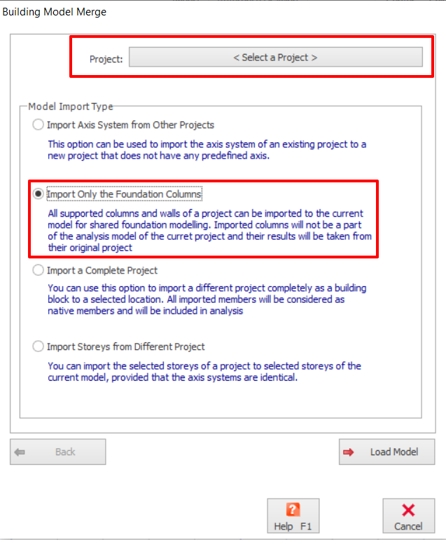 - In "Merge Building Model" tab, select a model project. Then, check "Import Only the Foundation Columns" option and click "Load Model".