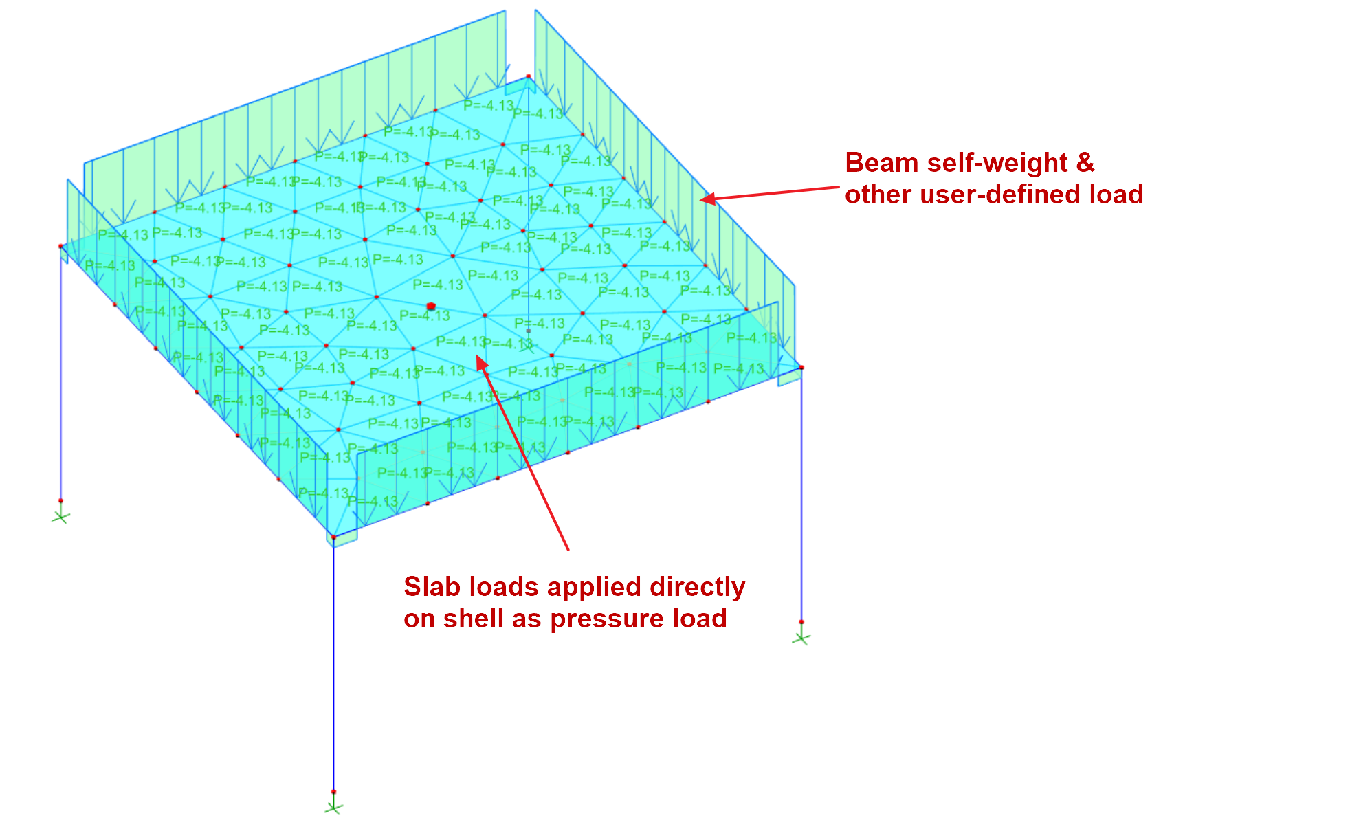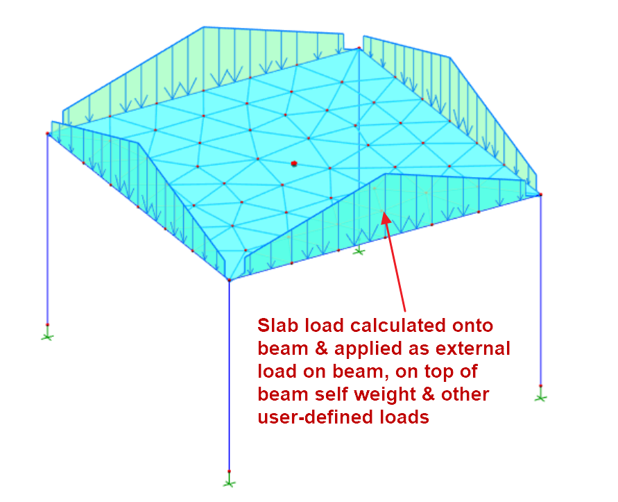 - For beam slab model, slab load will be calculated onto the beams using yield-line or FE Load Decomposition method ,and then applied as external frame load onto the beams during analysis.