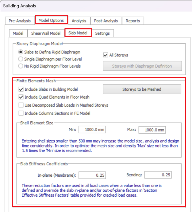 Parameters related to slab model consideration such as rigid diaphragm and meshing can be changed in Slab Model tab.
