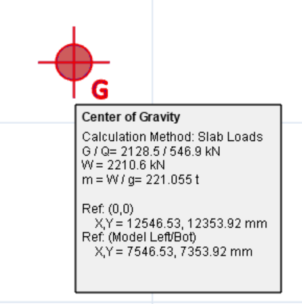 The mass/weight determined for the chosen option can be reviewed by hovering the cursor over the Center of Gravity indicated on the form plan after running a Building Analysis (example below)
