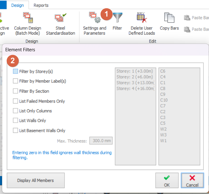 The mark in the “Print” column indicates that the member will be included in the output report. When the “Design Report” option is selected, only the members that are marked for printing will be transferred to the output report.