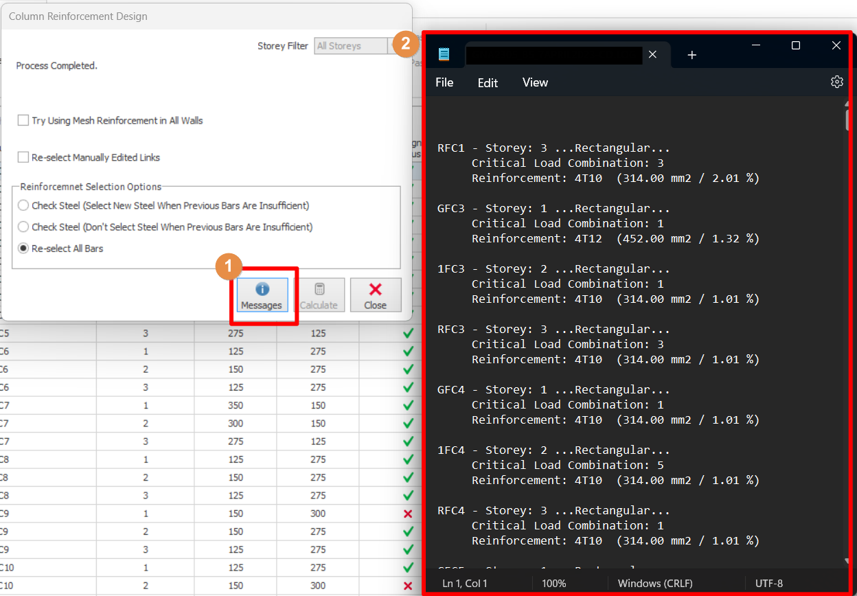 A report in TXT format is generated during the batch mode design to inform the user of any problems during the design process. You can review this report by pressing the “Messages” button in the “Column Reinforcement Design” dialog.