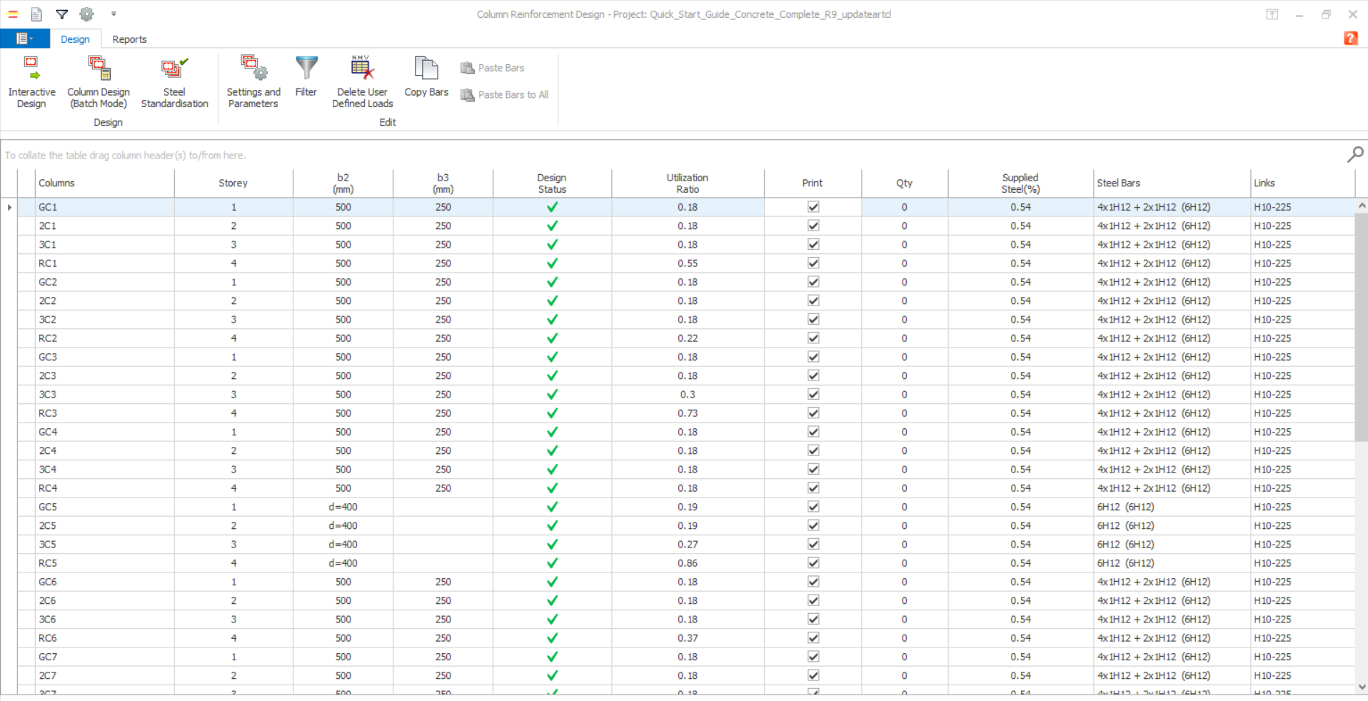 After closing the “Column Reinforcement Design” dialog the summary table is redisplayed. The “Design” and “Print” columns in the table will be marked for those members that have been designed successfully and the steel bars and links provided will be listed.