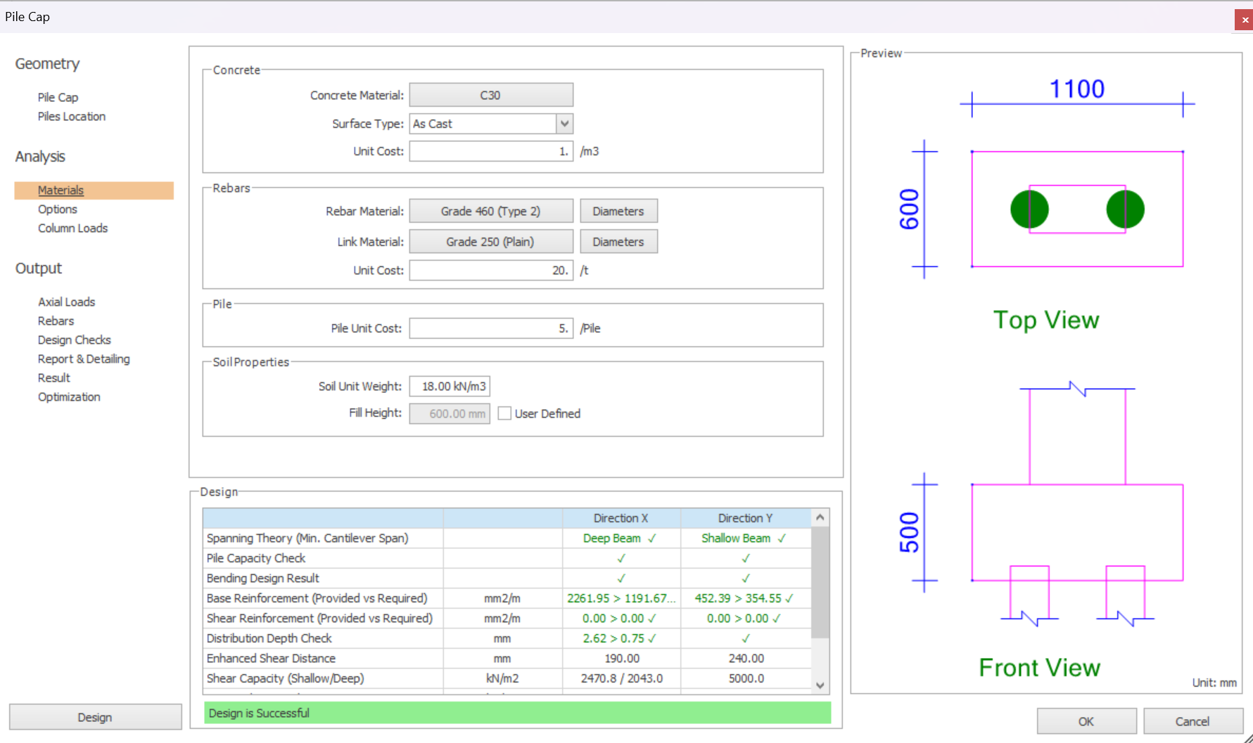 The min. pile cap depth, depth increment step and max. number of piles can be set in the   Options   tab. The unit rates of concrete, rebars and pile can be edited in   Materials   tab.