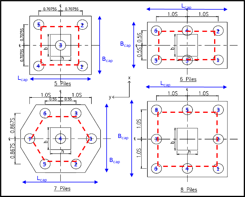 The shape and configurations of the pile and pile caps are essentially fixed in accordance with the above stated references, based on rigid pile cap assumption (examples shown below).