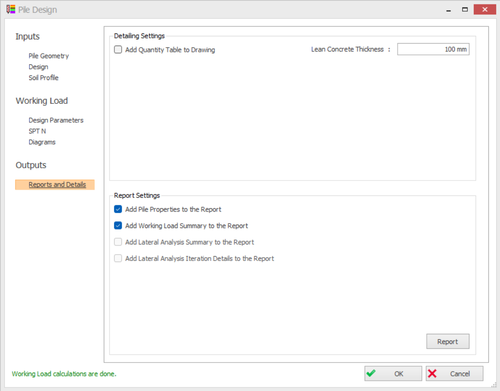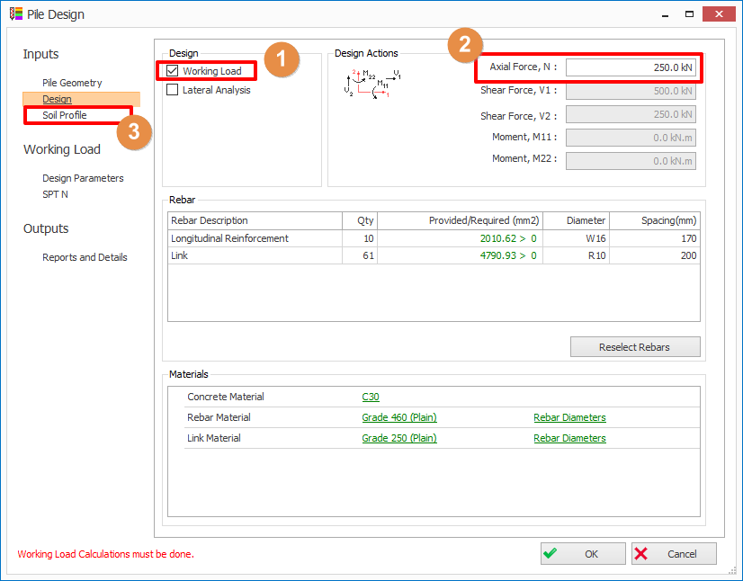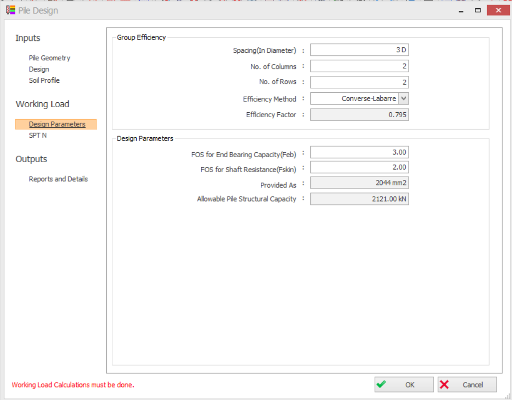 Pile Working Load will calculate the allowable pile structural compression and geotechnical capacities. Refer to following steps to calculate the pile working load: