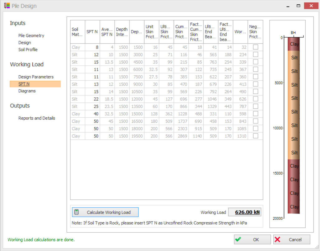 - You can review the SPT N vs Depth and Working Load vs Depth plots in diagram