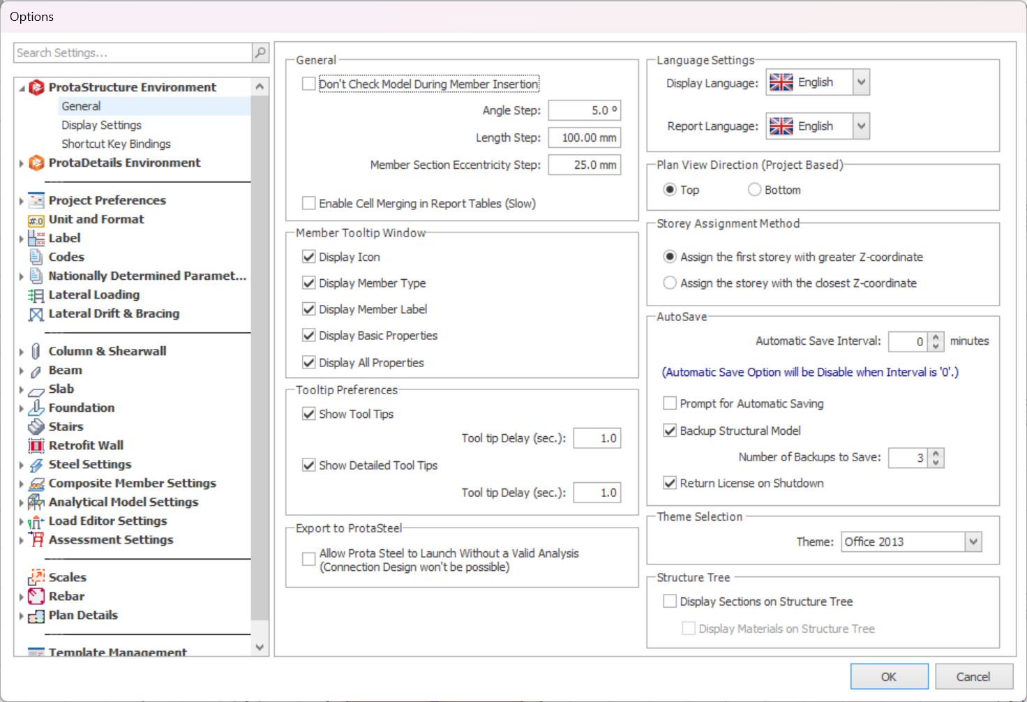 General settings of the ProtaStructure can be controlled in the General page under ProtaStructure Environment.