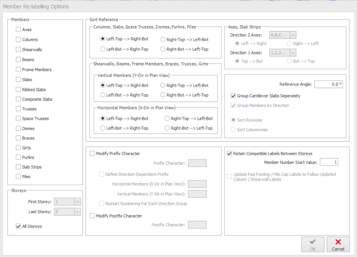 Using the dropdown lists in this section, you may re-label only the members in the range defined by “First Storey” and “Last Storey”. For re-labelling the members in a single storey, you can select the same storey in both lists.