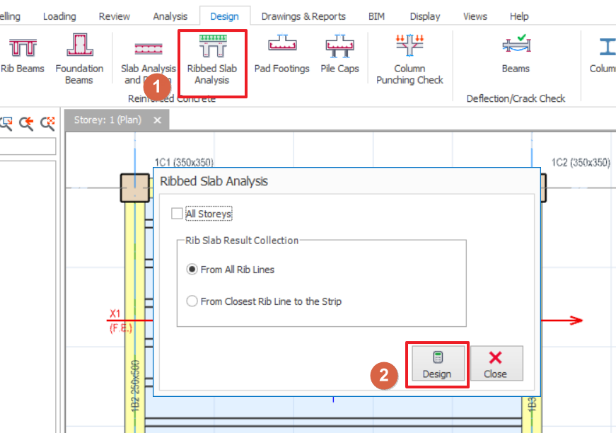- After you have performed Ribbed Slab Analysis, go to Concrete Design > Beam Reinforcement Design > Rib Beams