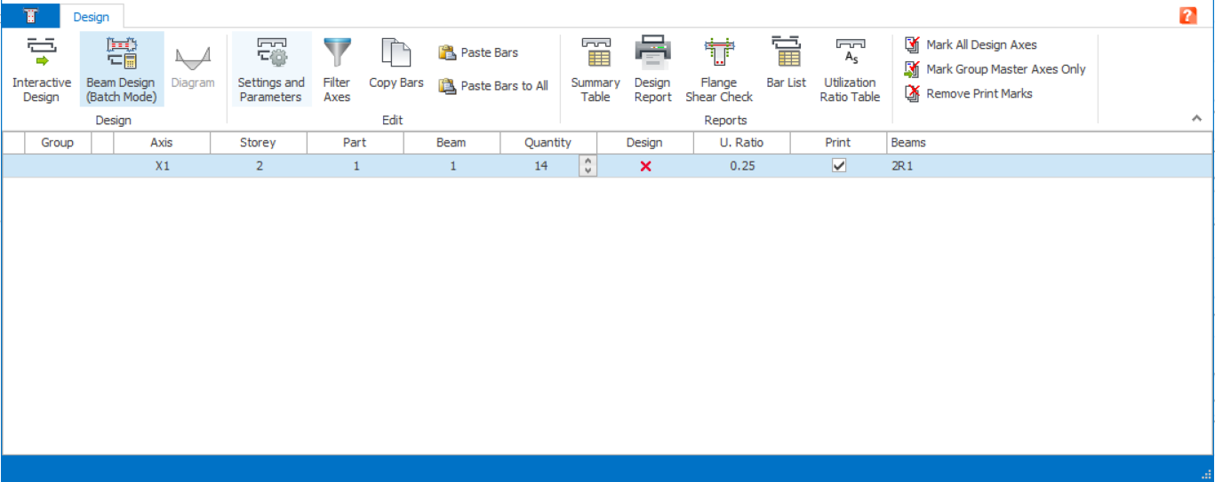 - The beam design menu will be shown and populated by the rib beams instead of storey beams.