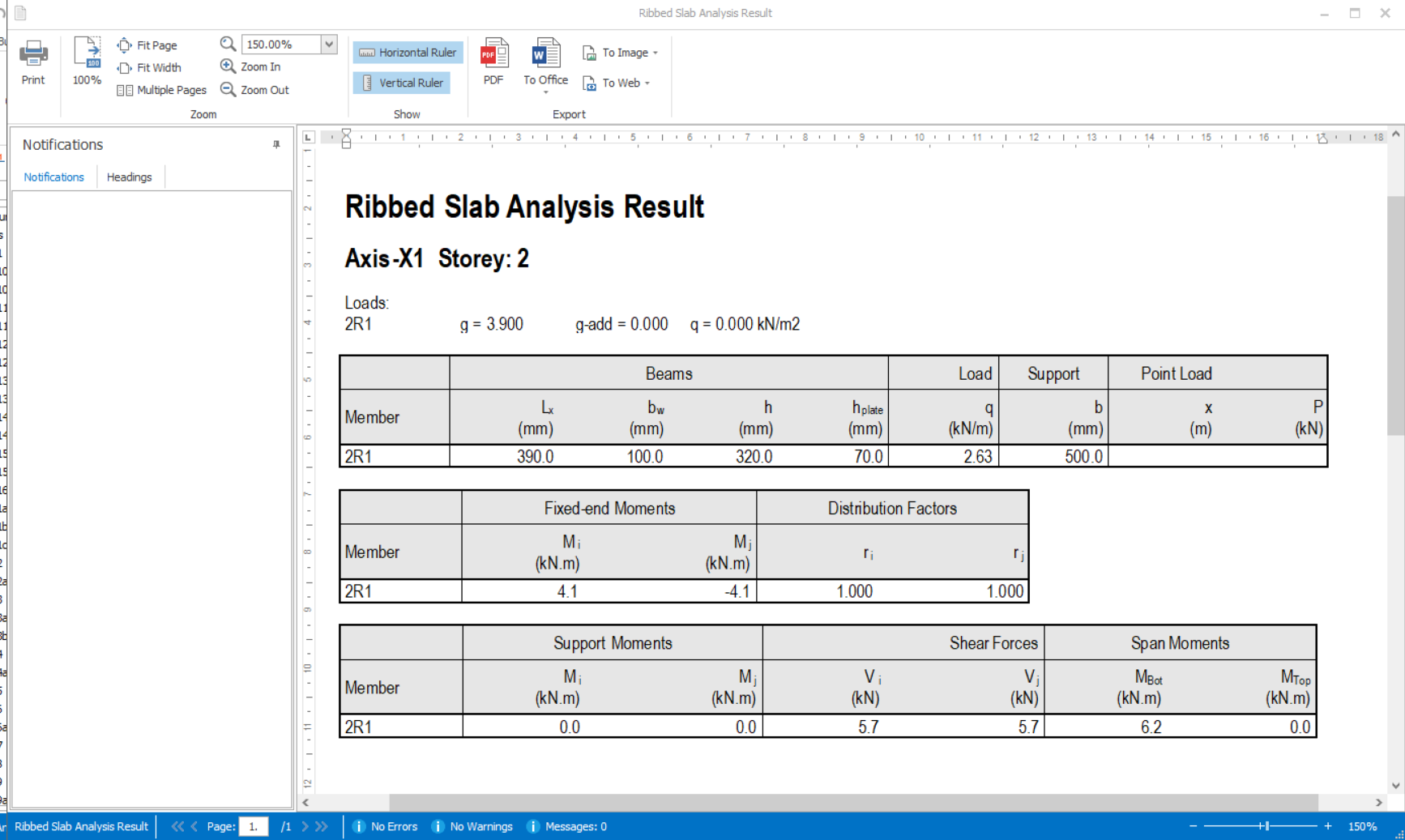 - Click on Concrete Design > Ribbed Slab Analysis. This will calculate the internal forces from existing FE Results.