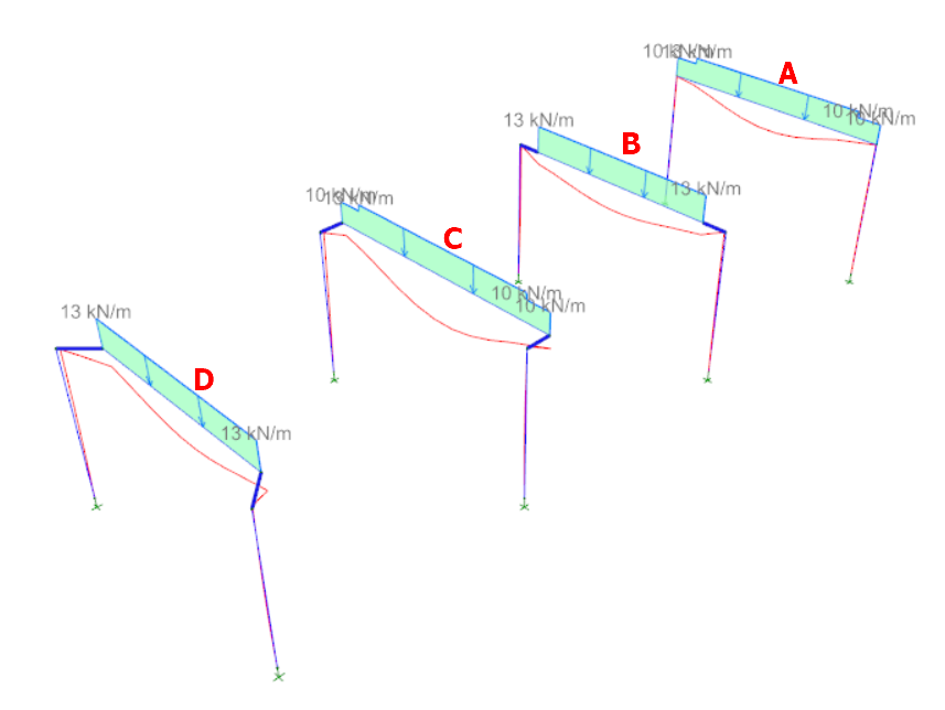 - This explains the change or "kink" in frame value at the face of the column, from 10 kN/m to 13 kN/m.