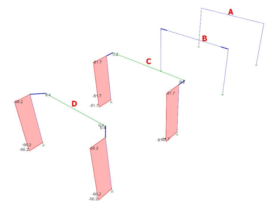 - Model A has no rigid link generated, the same maximum hogging moment in the beam is transferred to the column.