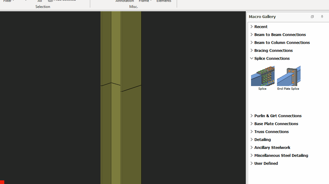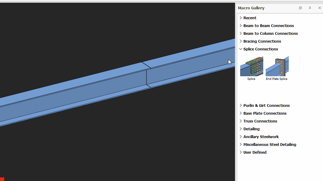 A Splice Connection Macro can be created between a beam & a beam or a beam and a column. Placing the mouse cursor over the Splice Connection Macro will reveal the tooltip describing the scope and steps of this macro.