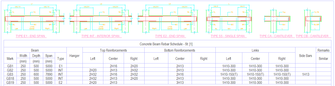 - Insert Concrete Beam Schedule: By checking this option, concrete beam rebar schedule will be printed.