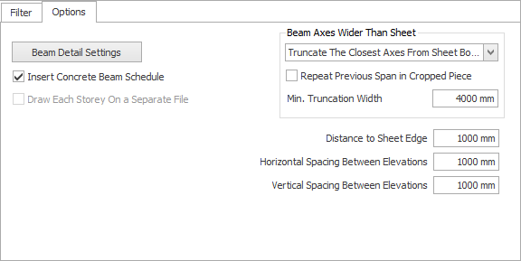 - Beam Axes Wider Than Sheet: In this field, user can choose how to automatically truncate the long beam elevations to fit in any sheet border. The option available here are: