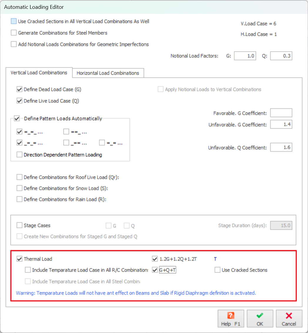 To use this function, the user must ensure that the "Temperature Loading" option is checked in the "Automatic Loading Generator". This ensures the program to include the thermal loads within the load combination. If this option is not checked, then a warning will pop up to prompt the user to assign temperature loads to the load combinations.