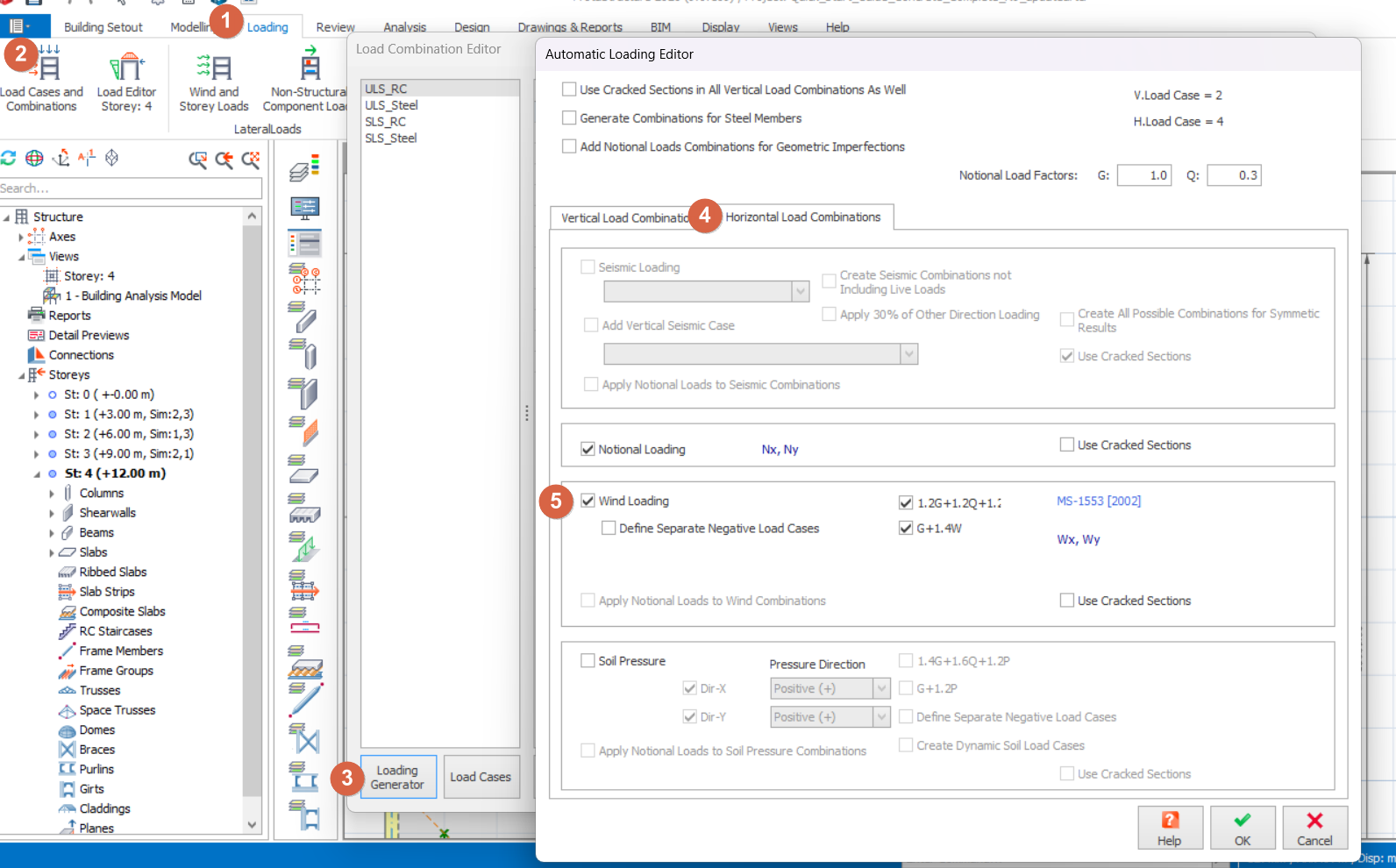 4. In Building Analysis menu, use Loading Generator to generate the wind load cases & combination