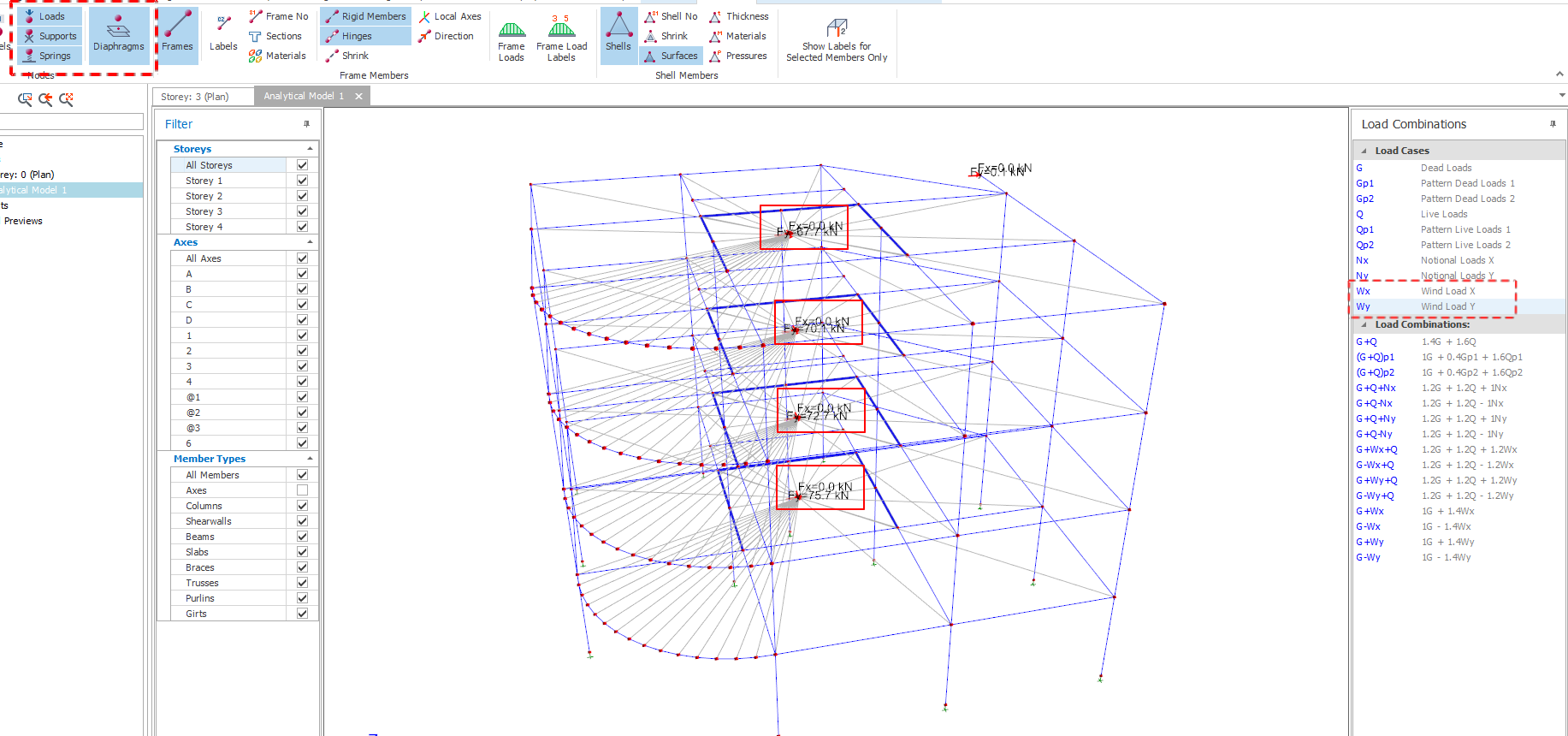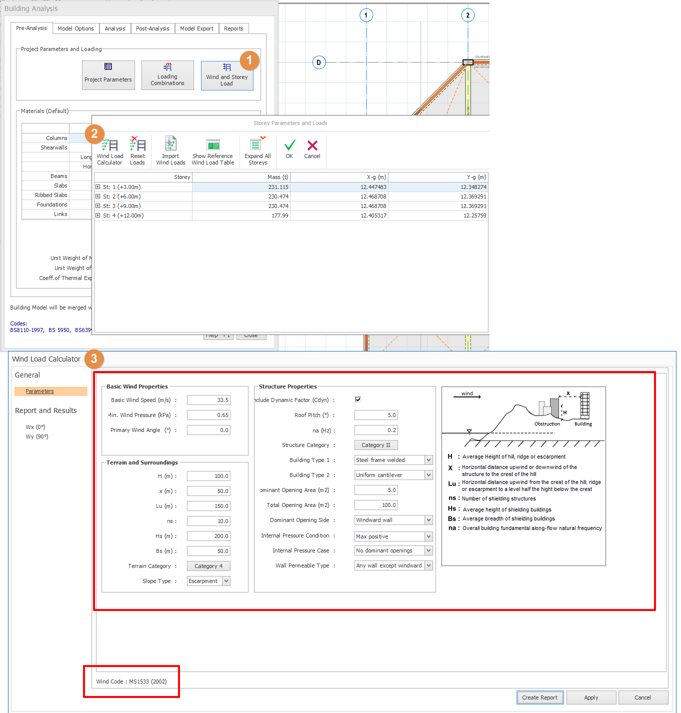2.  To apply the Wind Load to each storey: Building Analysis > Pre-Analysis > Wind and Storey Loads