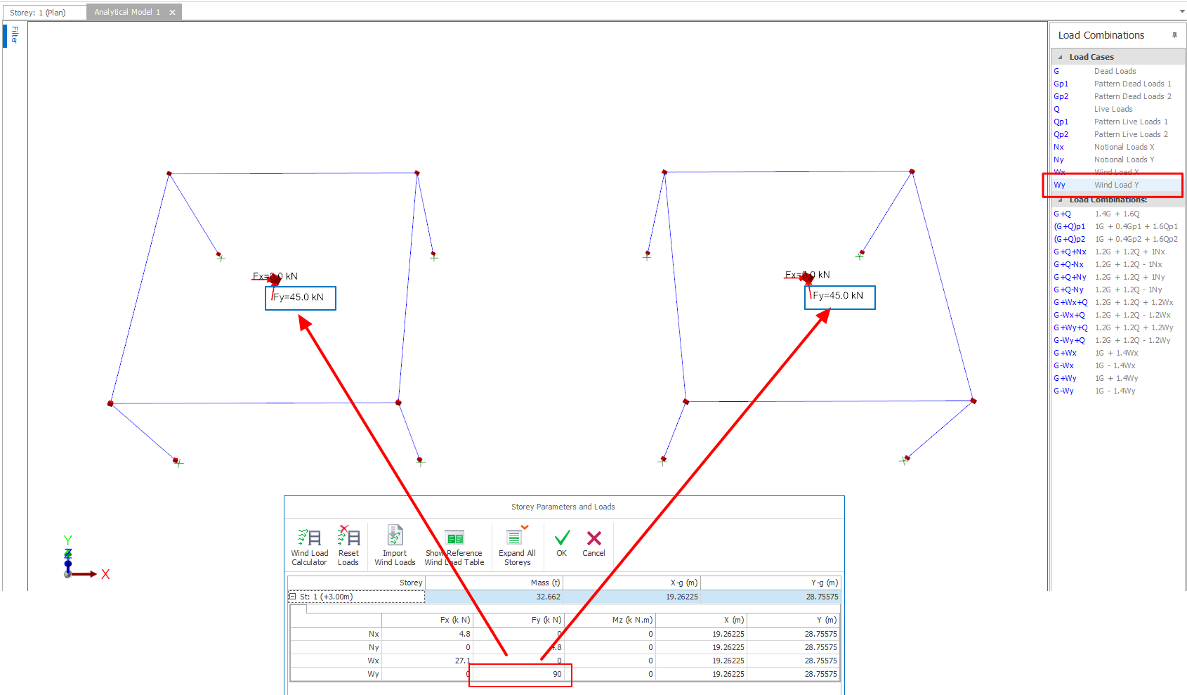 The wind loads, namely Wx and Wy are defined as point loads on each storey.  The coordinates (X, Y) of the applied wind loads are measured from (0, 0) – NOT from the bottom left corner (axes intersection) of the model.