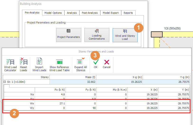 1. In "Pre-Analysis" tab, click "Wind and Storey Loads" button
