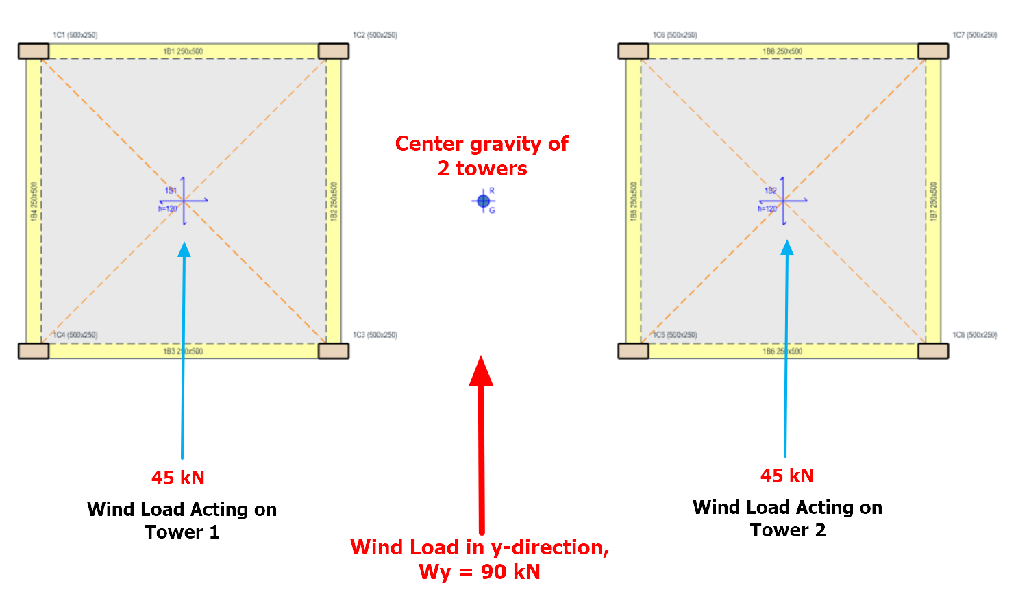 ProtaStructure will automatically distribute the wind load to the centre of diaphragm of each tower – the magnitude of the distribution is proportional to the mass of each floor.  Tower with bigger members and larger slab would have a higher mass and hence will attract more wind load.