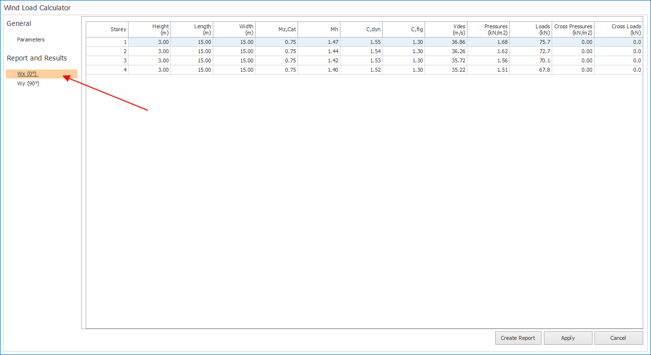 1. Click the wind load cases in the Report and Results in the left pane to review the calculated wind pressures and wind loads (as shown below)