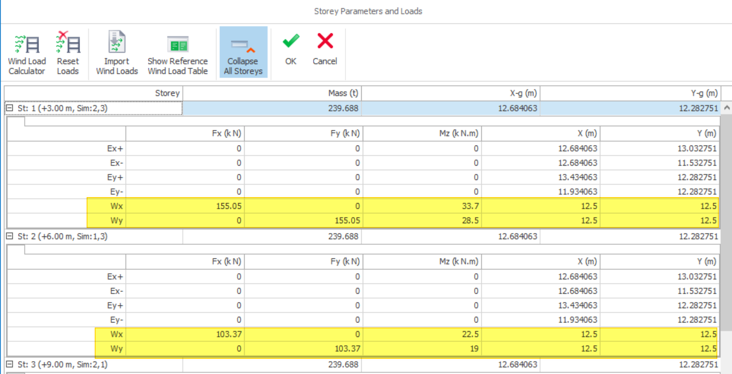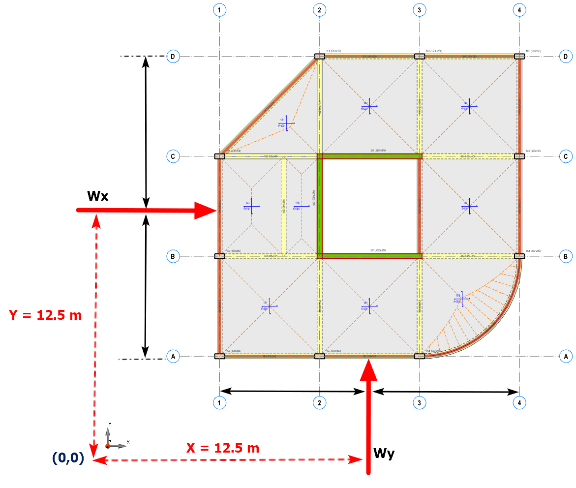 The wind loads, namely Wx and Wy are defined as point loads on each storey.  The coordinates (X, Y) of the applied wind loads are measured from (0, 0) – NOT from the bottom left corner (axes intersection) of the model.