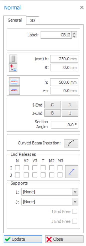 Choosing one of the options provided by Eccentricity Option Button when clicking it will automatically redefine the "e" field in the Beam Properties form. Update button must be clicked to update the selected beam with new eccentricity value.