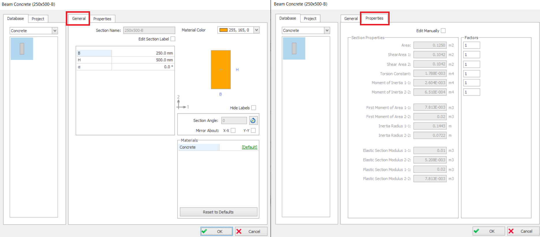 • The section name, display color & grade of concrete can be changed in “General” tab.• The moment of inertia, section area and shear areas, etc can be reviewed in the “Properties” tab.
