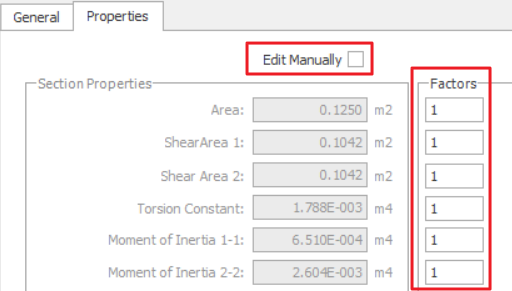 - Check "Edit Manually" & manually enter values. Be warned that this will de-link the auto-calculation of section properties, e.g. when column sizes change.