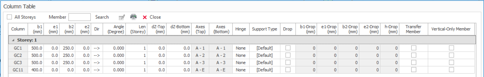 For example, if a column in the 4th storey spans to the 2nd storey top level, this means that the column will exist along 4th and 3rd storeys. Therefore, "2" must appear in the "Len (Storey)" field.