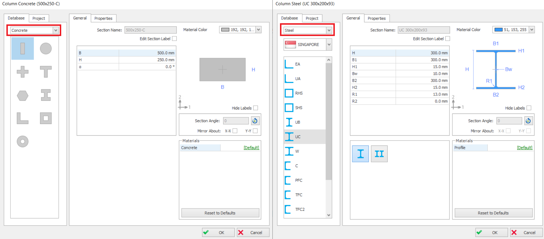 - Concrete : If concrete is chosen, various types pre-defined shapes such as "L", "T", "I" can be selected.