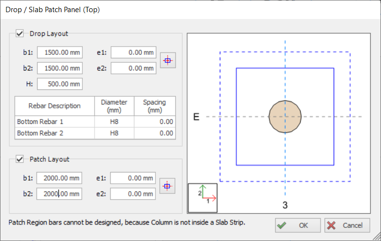 . “e1” and “e2” values will automatically be determined according to the column size. - "H" field is the total depth of the Drop Panel, measured from top of the flat slab. Hence, the value must be more than the slab thickness.