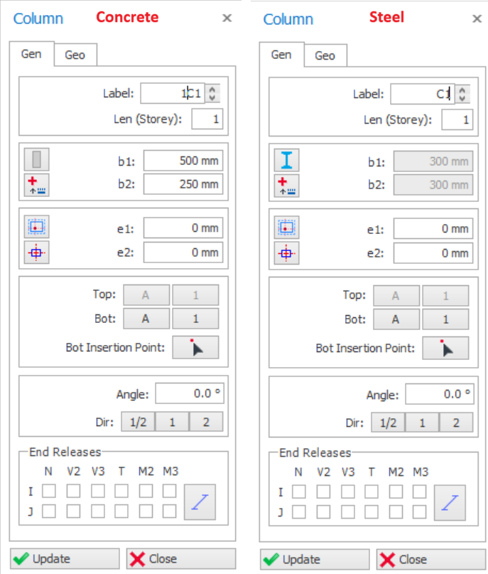 - When "1" is pressed, "b1" dimension of the column will be set parallel to the direction-1 insertion axis that appears in the "Axes" fields. "b2" dimension will be perpendicular to this direction.