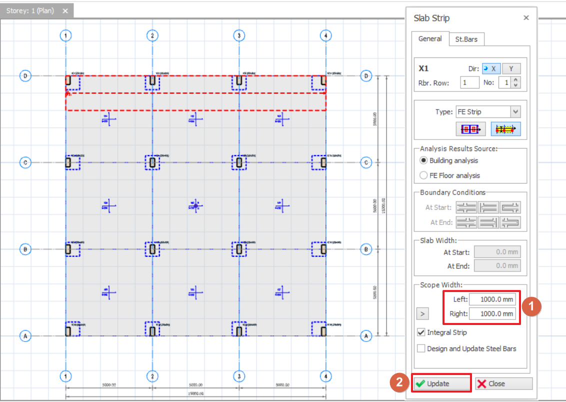 - Alternatively, you can try to show rebars on the model plan view, but it is important that you define and cut the correct Finite Element Slab Strip – for you model that would be “Fixed Width Band strip”. More details are available under Slab Strip Type (Working with Slab Strips and FE Strip-Fixed Band Strip sections)