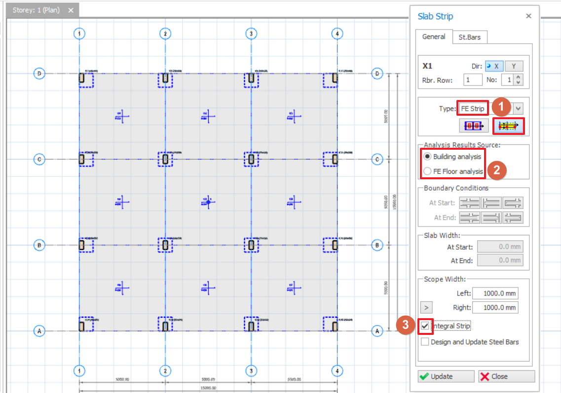 Above : Select FE Strip and choose fixed band strip in Slab Strip properties. Then select the Analysis result source and check “Integral Strip”.
