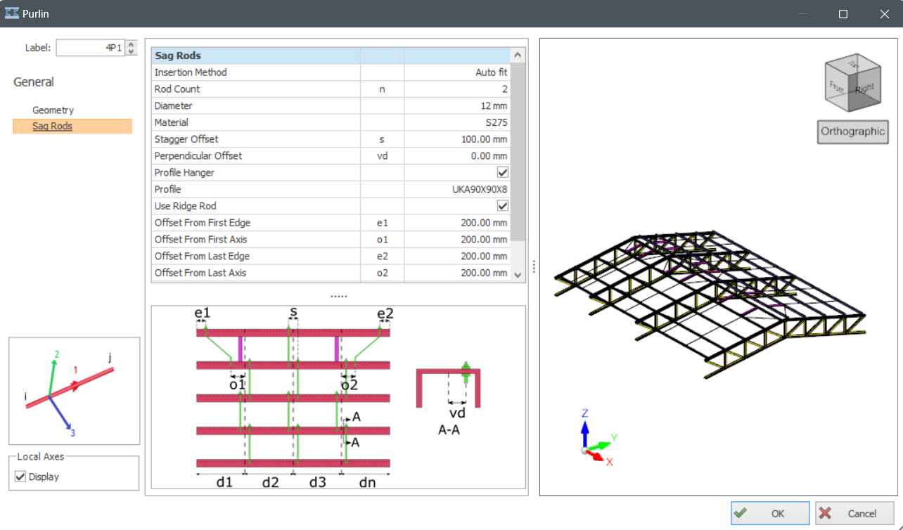- Click "Sag Rods" under General options to model edit geometric properties of sag rods.Sag rods decreases the buckling length of purlins and girts. You can include effects of sag rods into building analysis by checking "Include in Analysis" option.