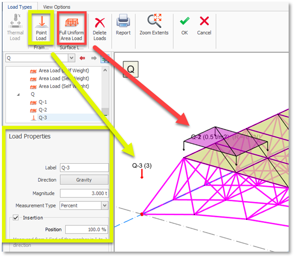 3. On the load editor you can assign Uniform Area Loads on any region on the truss cladding or Point Loads on any joint under