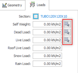 The cladding loads library is provided for easy application. The library can be accessed by clicking the small button next to Self-Weight, Dead Load and Live Load field. Roof Live Load, Snow Load and Rain Load fields