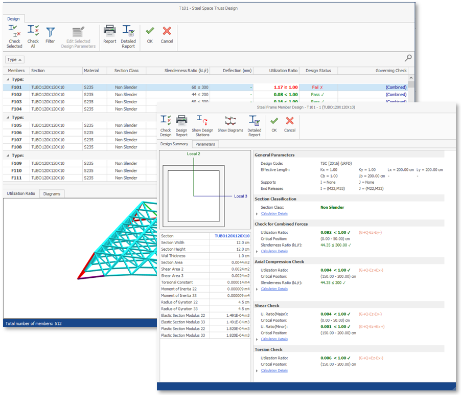3. Click Check All button to design all space truss sub members. The steel design will take place